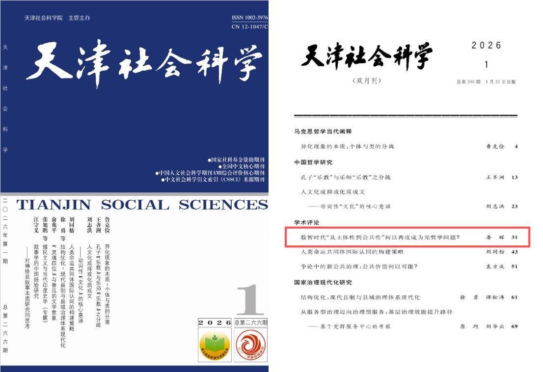我院高层次驻院研究员晏辉教授在《天津社会科学》2026年第1期发表论文:数智时代“从主体性到公共性”何以再度成为元哲学问题?