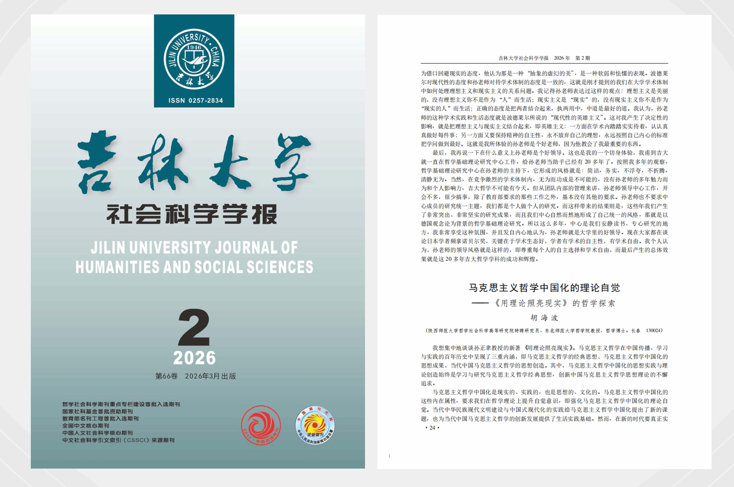 我院高层次驻院研究员胡海波教授在《吉林大学社会科学学报》2026年第2期发表论文:马克思主义哲学中国化的理论自觉——《用理论照亮现实》的哲学探索。
